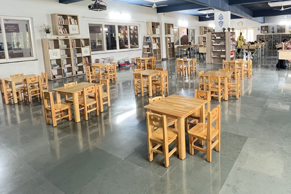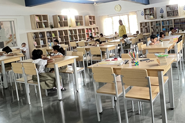 Classrooms are equipped with movable desks and reading corners to allow for group discussions, peer learning, and quiet reflection zones.